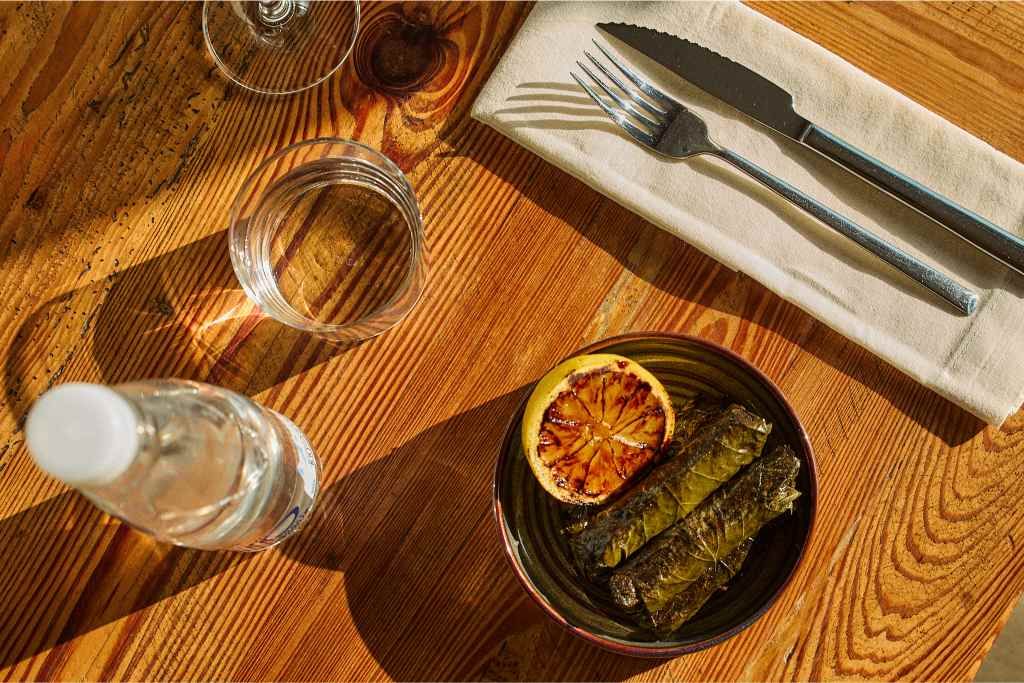Cocinar el arroz con agua y sal. Mezclarlo con la trucha cortada en cubos, feta desmenuzado, olivas picadas y especias. Pasar las hojas de parra por la plancha y rellenarlas con la mezcla, cerrando en forma de paquetito. Dorar los dolmas por todos sus lados. Asar el limón hasta que caramelice y servir junto con los dolmas y un hilo de aceite de oliva.