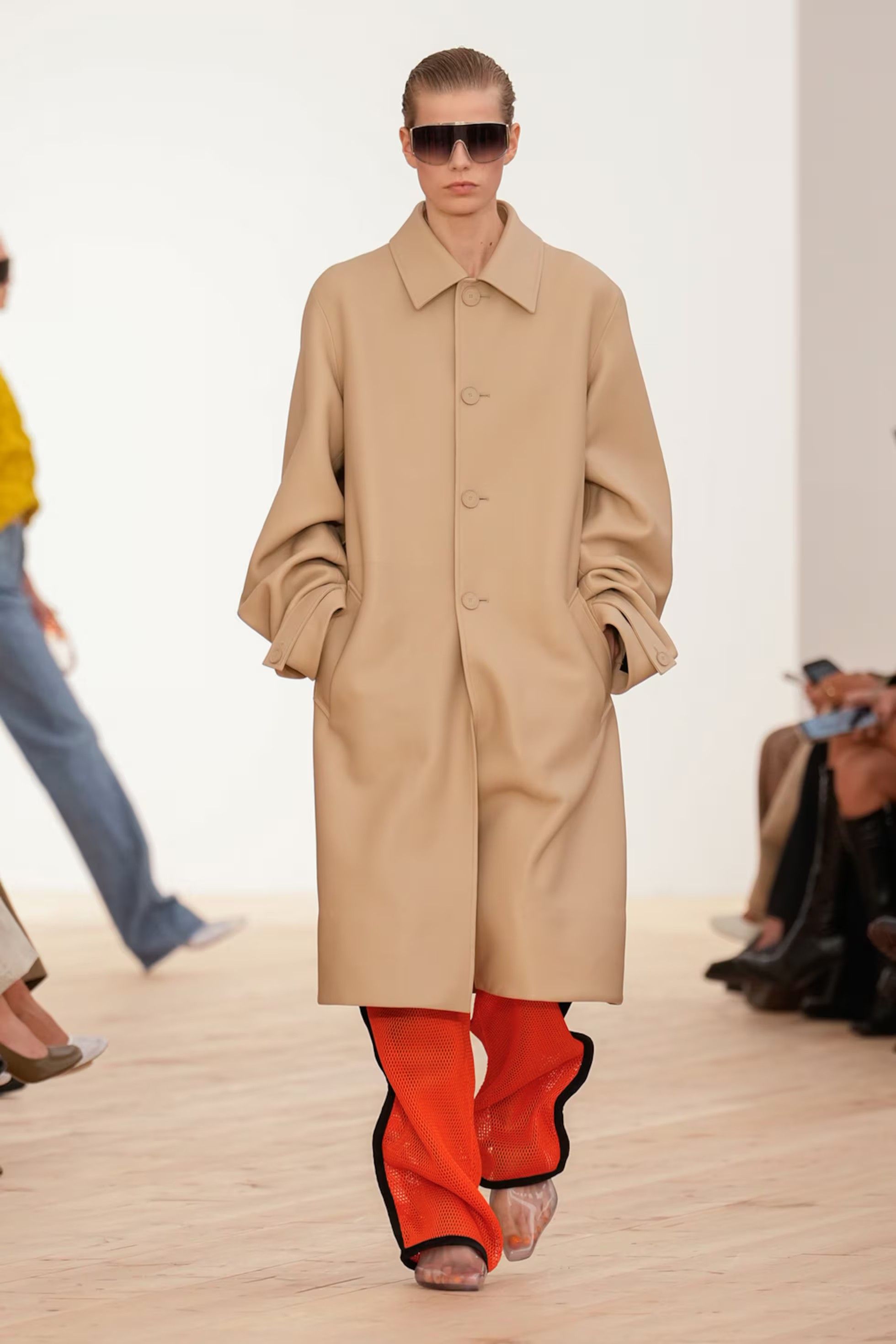 Si Proenza Schouler había virado en sus últimos años hacia el minimalismo, en Loewe el dúo apostó por una paleta vibrante. Amarillos intensos, naranjas saturados y rojos encendidos convivieron con neutros estratégicos. El “amarillo pollito” dominó varias salidas, desde abrigos estructurados hasta vestidos micro de textura escultural. Esta declaración cromática marcó distancia con la sobriedad reciente de su propia marca y abrió un nuevo camino para Loewe.