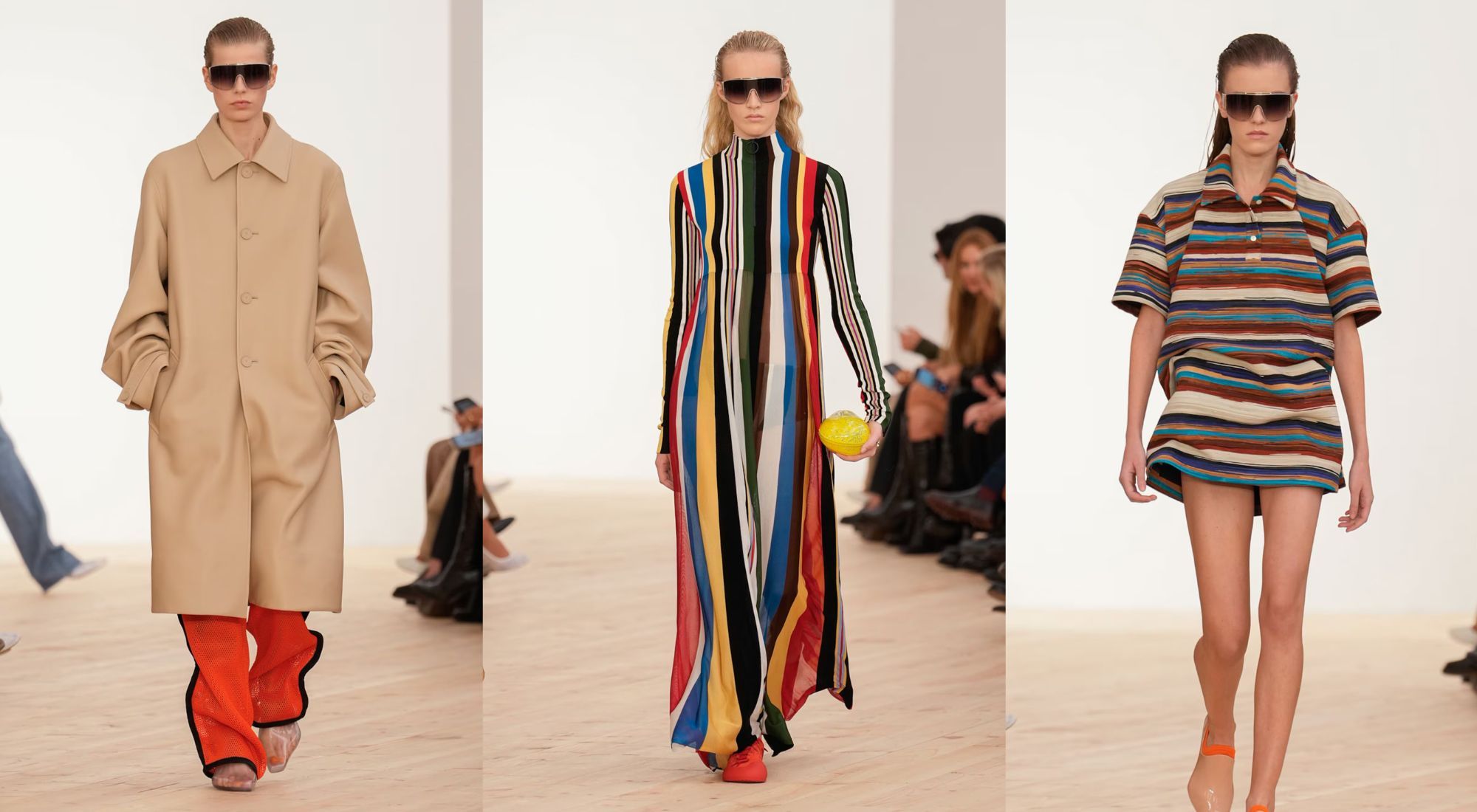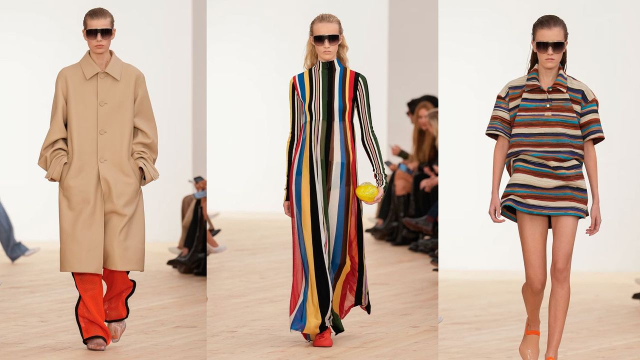 Las rayas fueron uno de los hilos conductores: en microvestidos, en camisas alargadas que asomaban bajo shorts y en vestidos voluminosos con escotes escultóricos. Su uso no fue decorativo, sino arquitectónico: cada línea ayudaba a moldear siluetas y a crear ritmo visual en la pasarela.