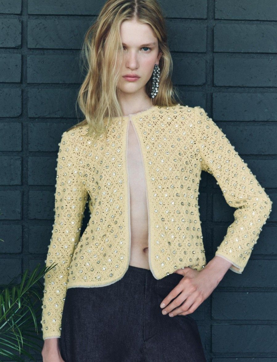 Esta propuesta de chaqueta elaborada con cristalería demuestra que el butter yellow también puede ser formal y elegante.