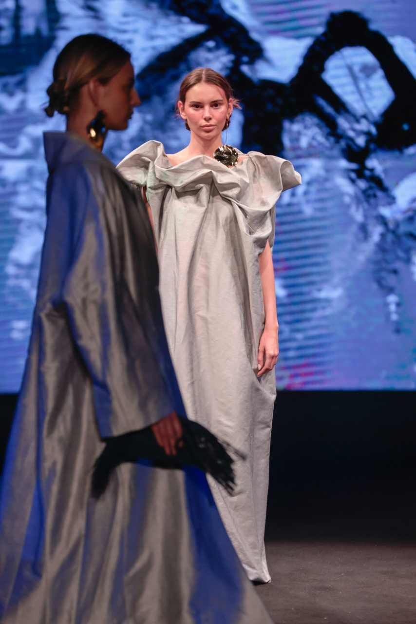 Entre tantas propuestas, cinco pasarelas se destacaron por su fuerza visual e impronta internacional. La Petite Morte, con su colección Temporada de Sol, deslumbró con sastrería reinterpretada en clave moderna, cuellos grandes, corbatas y maxi flores como apliques. Lyenzo y Steven Valencia apostaron por vestidos estructurados, brillo, corsets bordados y pantalones sastre oversize. La Mía Maneta por Amodomio presentó una propuesta experimental con superposiciones, cuero de verano, formas irregulares y prendas oversize que llamaron la atención. Pink Filosofy montó una pasarela zen con un enorme gong y músicos cantando mantras, mientras desfilaban diseños en tonos tierra, géneros nobles y accesorios en fibras artesanales. Por último, las mexicanas Julia y Renata, invitadas especiales, llevaron una colección de siluetas amplias y genderless con recortes asimétricos y maxi colgantes que marcaron la diferencia.