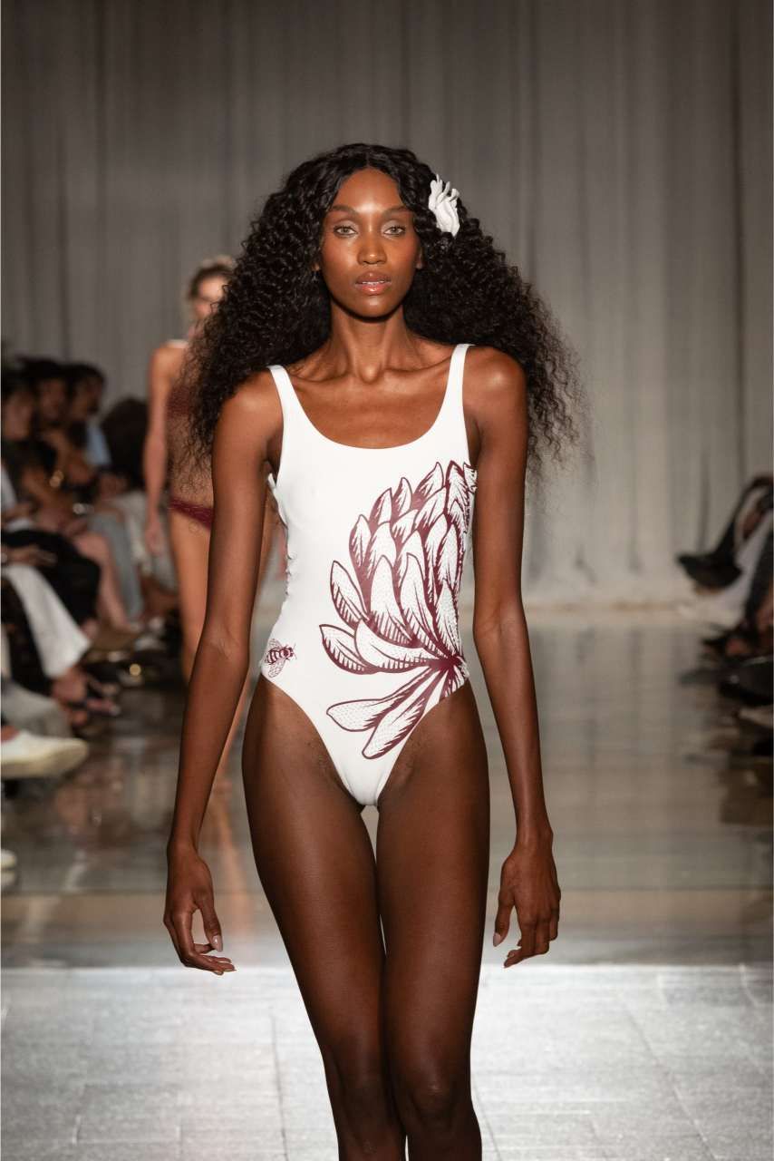 El swimwear colombiano también mostró una evolución notable. Agua Bendita, con proyección internacional, inauguró la feria en la Plaza Botero con una colección donde regresaron las enterizas de cortes originales y las bikinis con bordados, texturas y accesorios sofisticados. Bronzini x Alado presentó piezas tejidas y morfologías innovadoras, con detalles artesanales que elevaron la categoría de los trajes de baño. La modelo y presentadora Laura Tabón, con su marca Sea Salt en colaboración con Soccarrat, desfiló en el Palacio de la Cultura y se llevó aplausos por sus diseños sofisticados en negro, tonos vibrantes y combinaciones de colores inesperadas, enriquecidas con bordados y apliques.