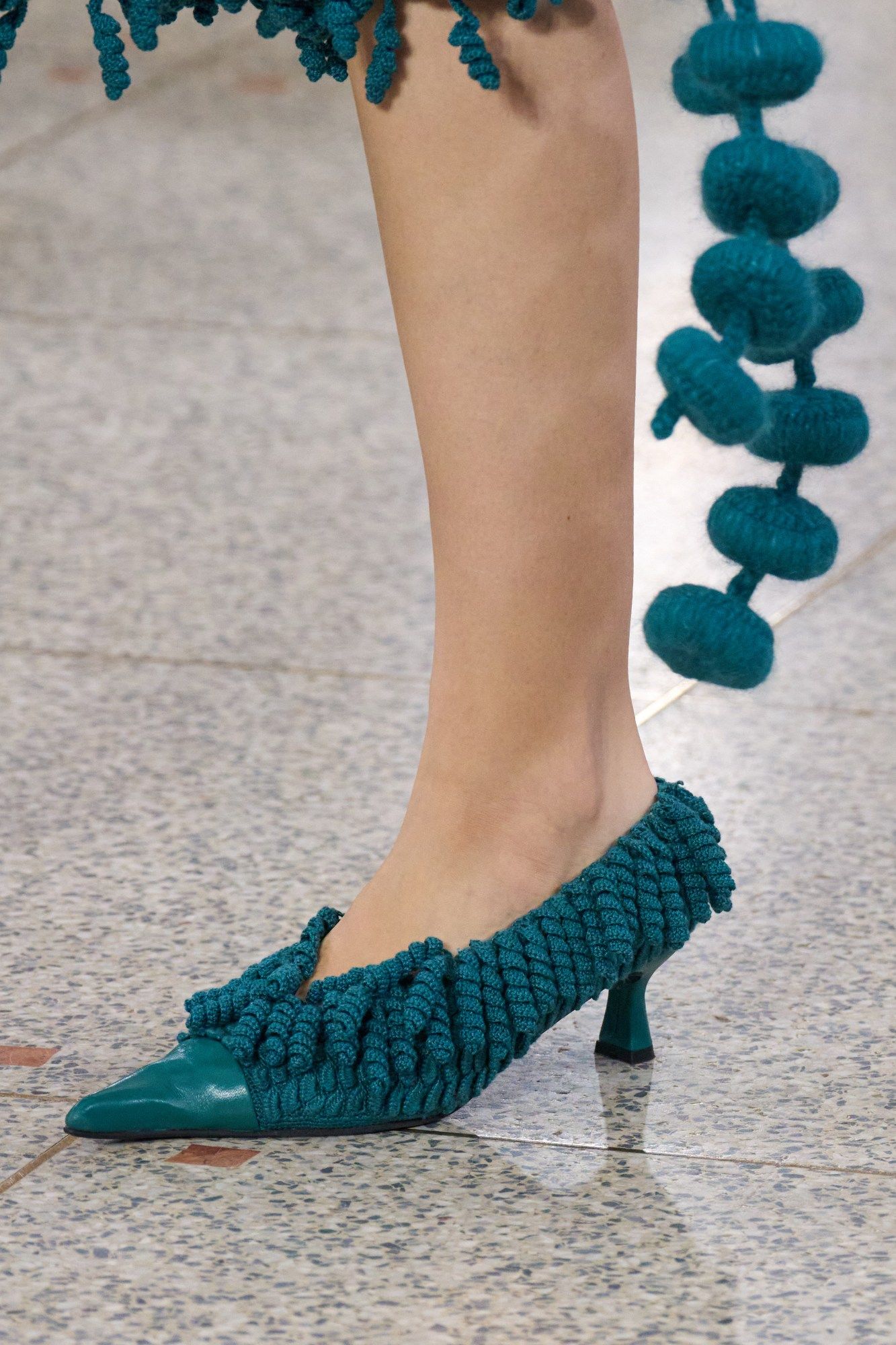 Firmas como J. Salinas exploran materiales que desdibujan lo cotidiano, llevando el knitwear o las plumas al terreno del calzado. La narrativa del look comienza desde los pies.