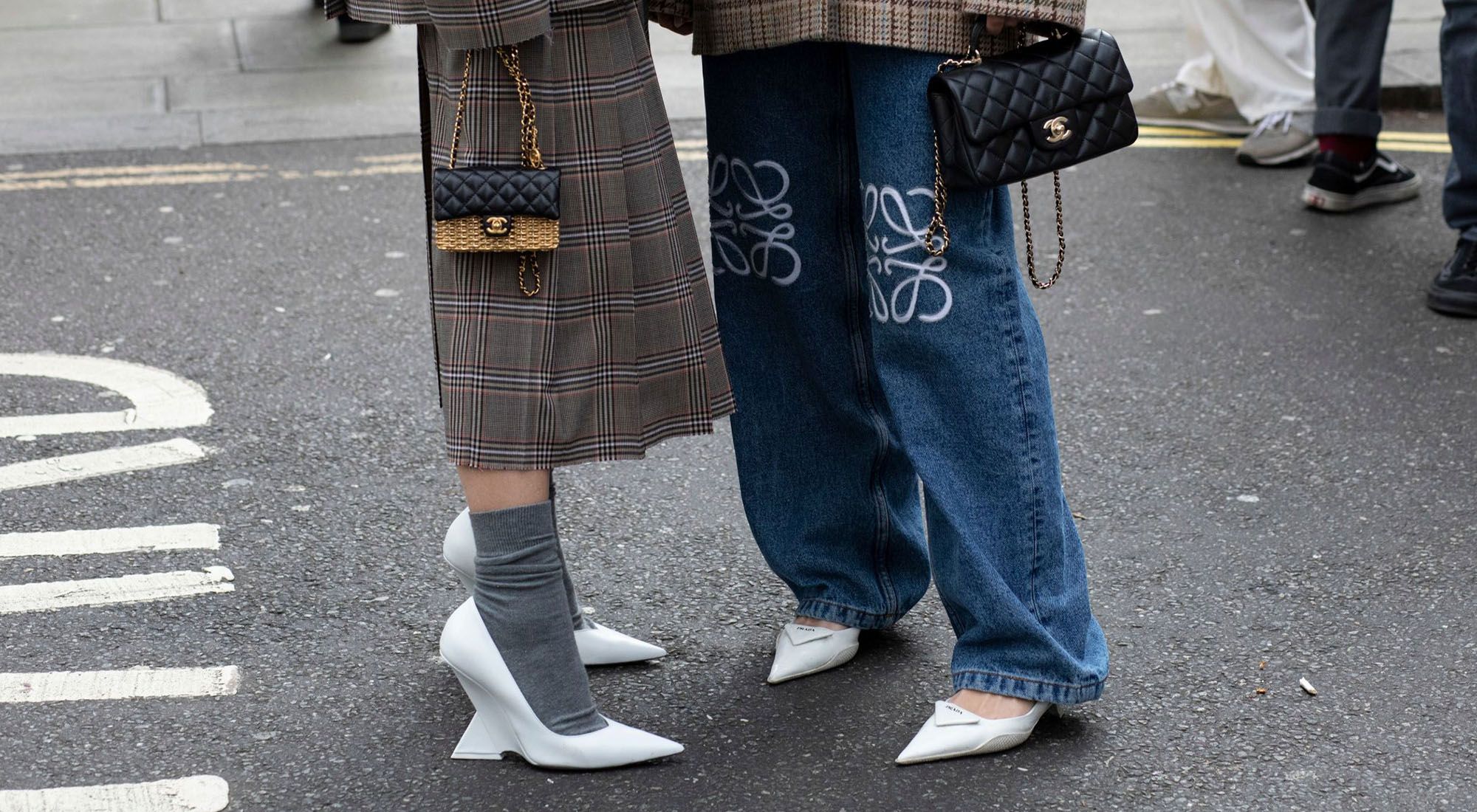 El revival de los años 20 se hace presente en esta combinación. Los tacos se llevan con medias para jugar con contrastes de textura y proporción, sumando un gesto femenino y sofisticado.