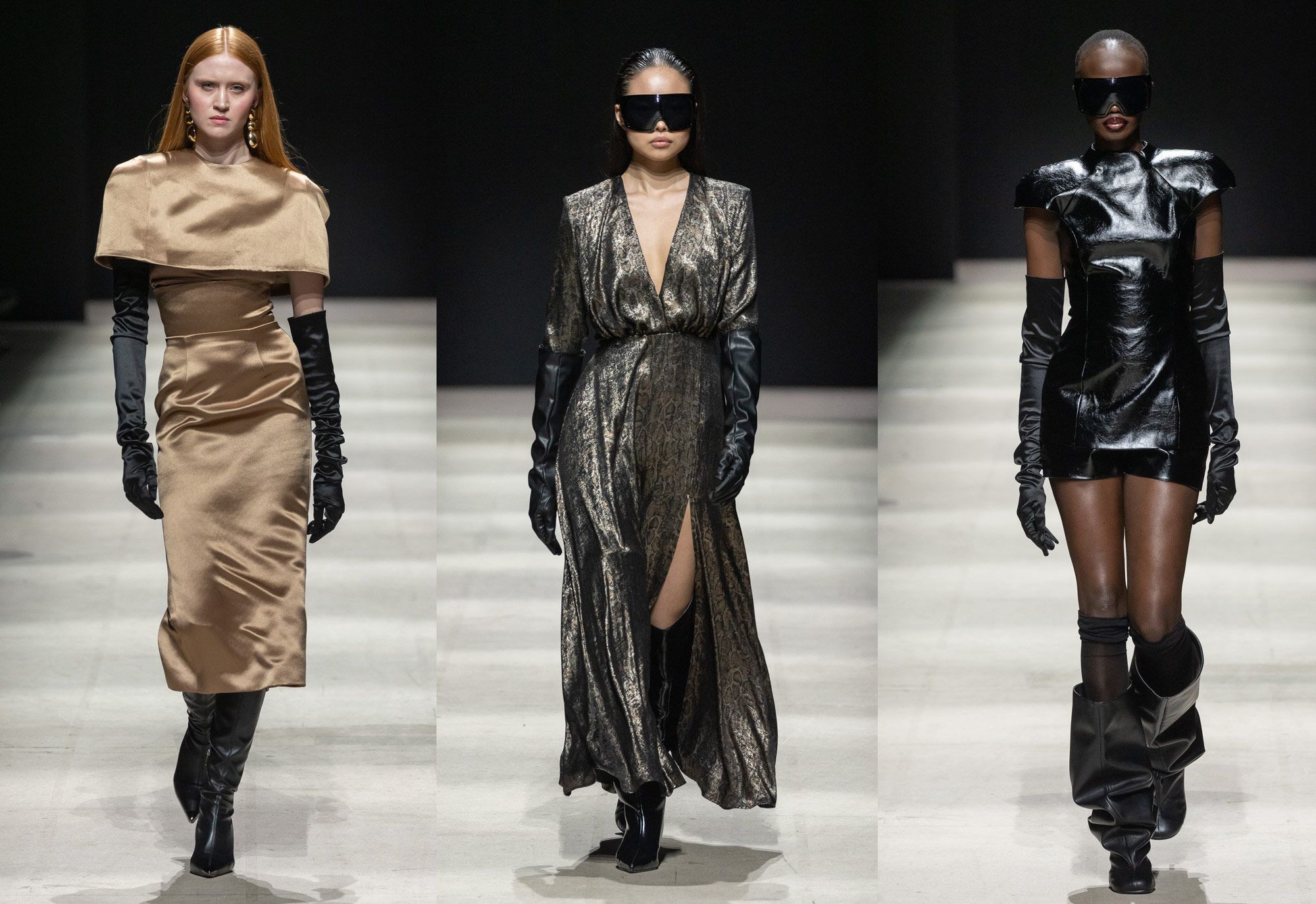 La marca presentó una colección con estilo futurista donde el brillo total es la clave. Tanto en negro, plateado o dorado, las prendas en cuero charolado, muestran siluetas gráficas, hombros marcados, líneas complejas, minis combinadas con botas bucaneras y capas impactantes.