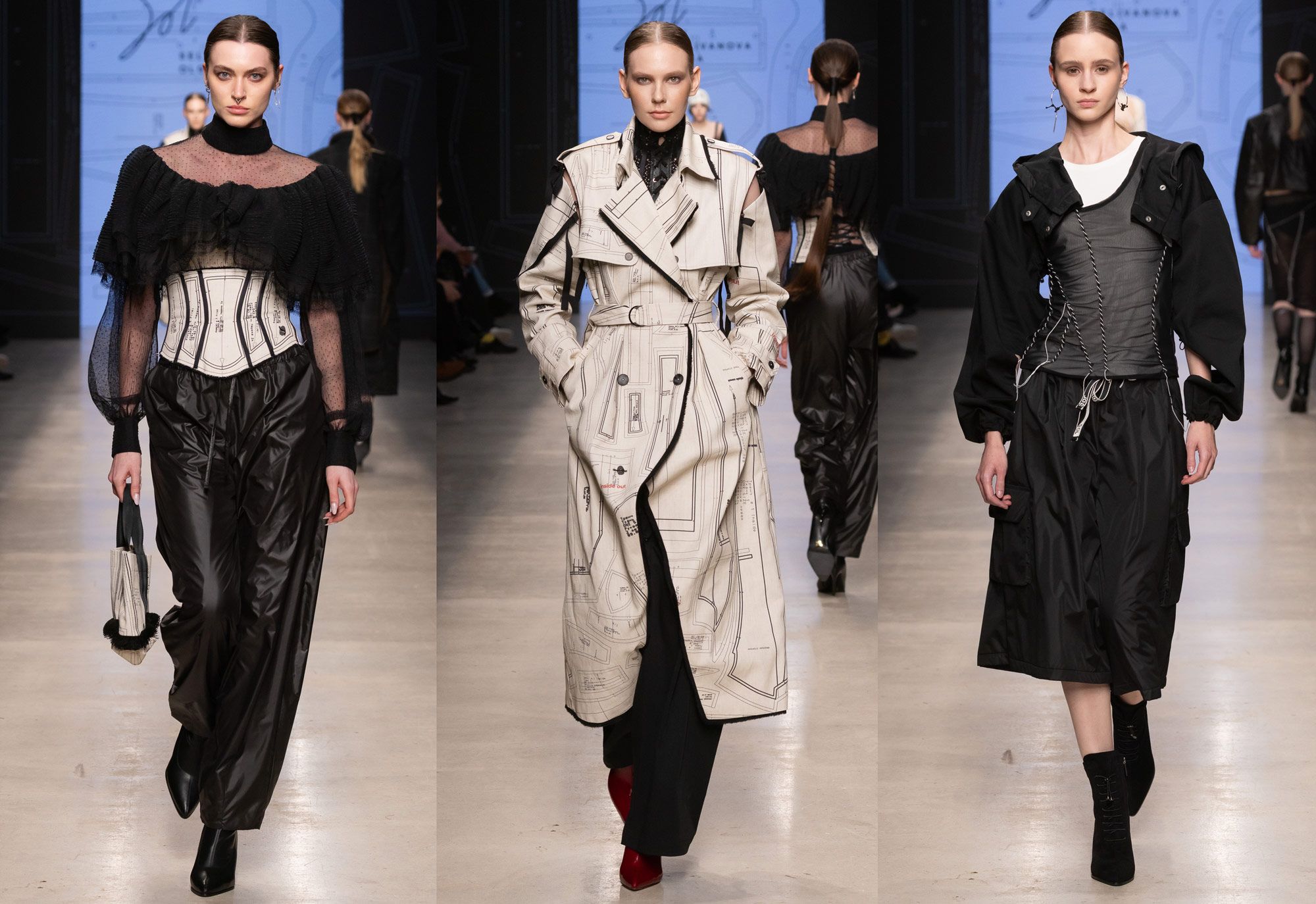 La firma de San Petersburgo mostró una colección en la que predomina el negro y cortes complejos, con pequeños toques de materiales en relieve, pliegues y acento en las texturas.