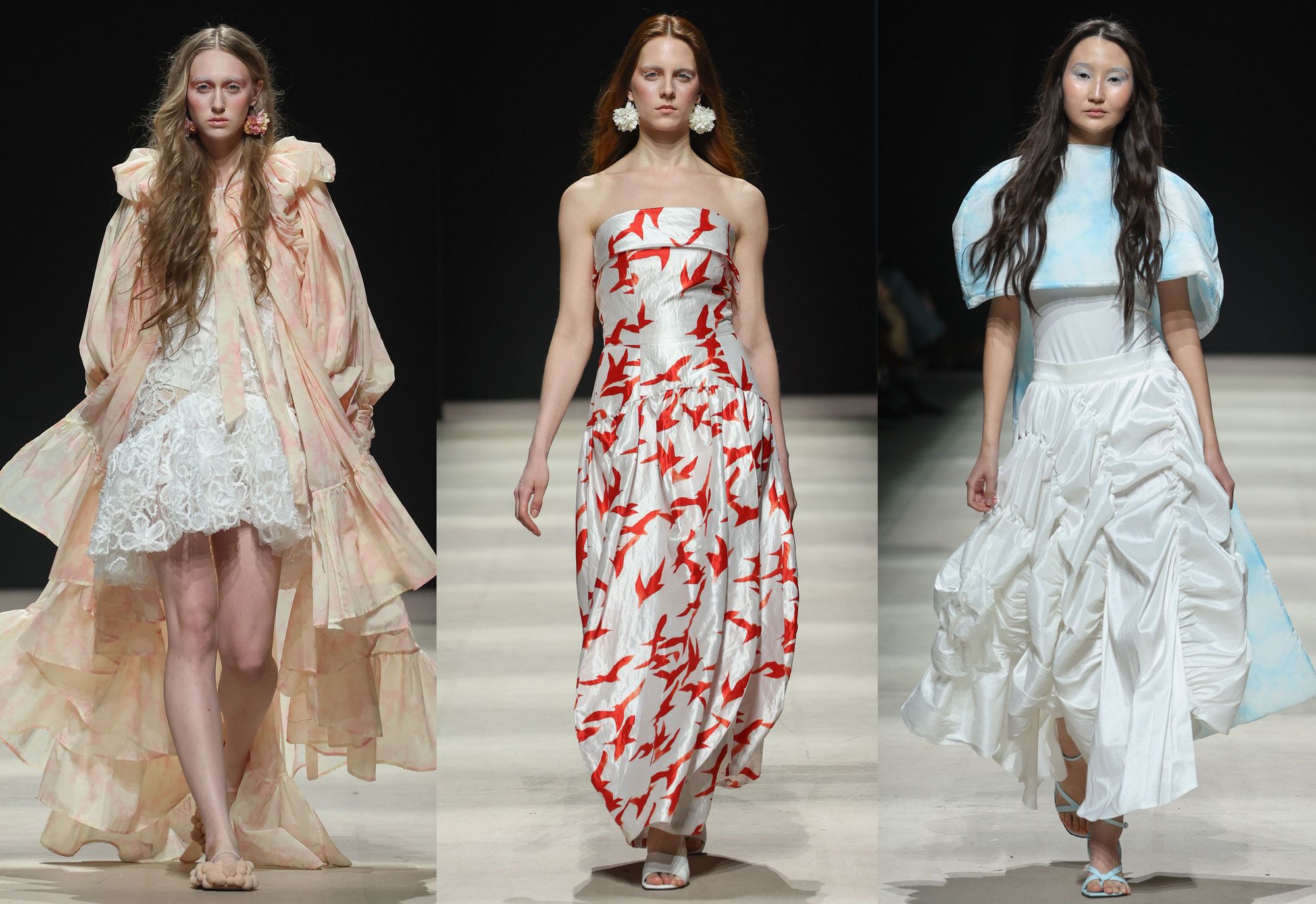 Inside Out pone el foco en costuras expuestas y encaje: fluye en faldas, se ajusta en corsets y aparece como accesorio. La paleta neutra —beige, gris y negro— se acentúa con toques de rojo.
